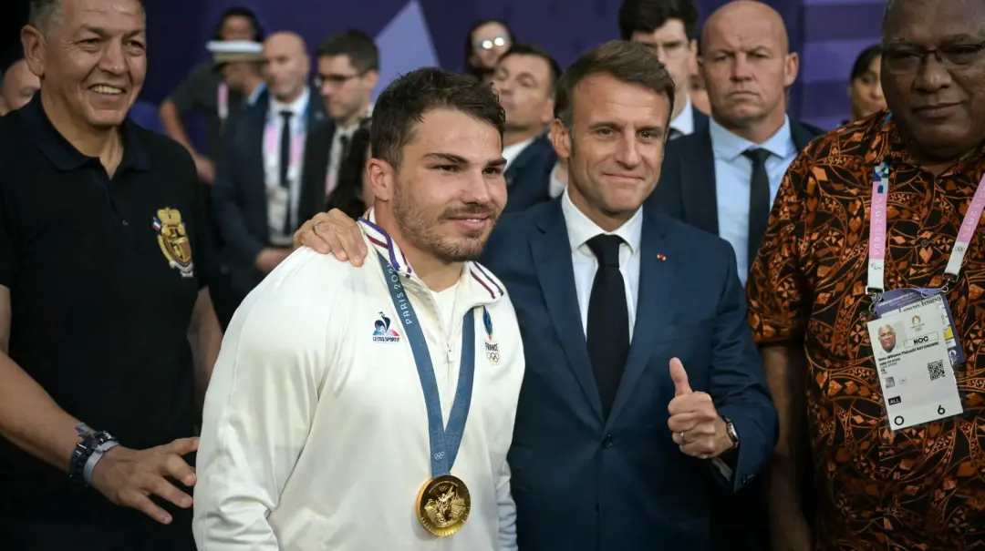 ▲ 法國總統馬克龍見證“柒人制橄欖球比賽”奪法國奧運“首金”。(法新社)