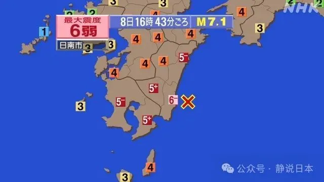 日本(专题)時間8月8日(昨日)下午4時43分,日本九州地區宮崎縣近海發生了7.1級地震,這壹地震造成了九州地區許多地區的震級達到6級。到目前為止,有2棟房子倒塌,12人受傷,沒有人員遇難。