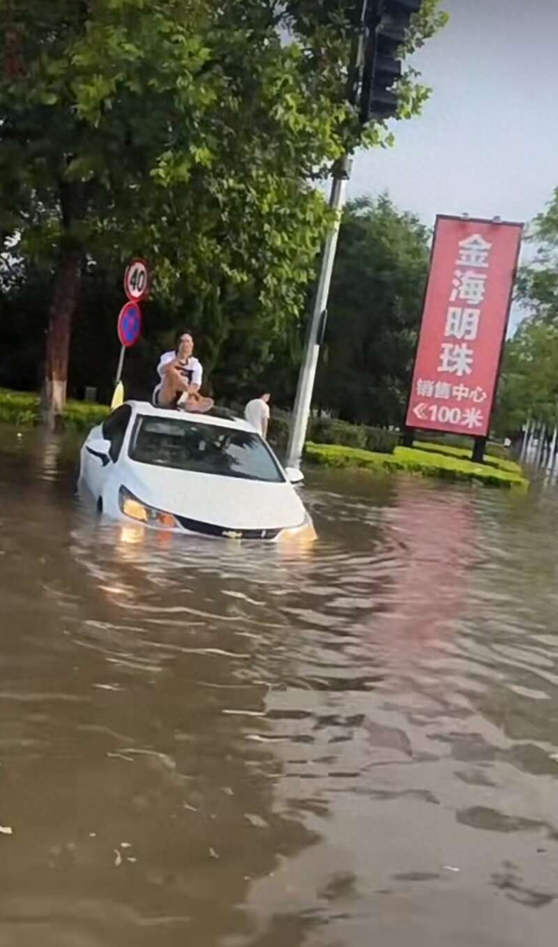 市民坐在被泡水的汽车车顶。图/受访者提供