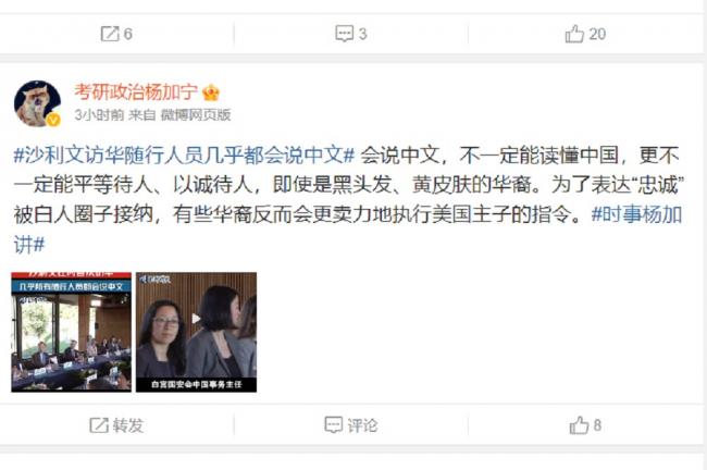 美國白宮國安顧問蘇利文訪問中國,中國官媒指出,此次蘇利文訪中團隊成員,幾乎所有人都會說中文,壹些學者認為,此次交流可能不僅止於象征性的,中國網友則稱會說中文,不代表就能讀懂中國。
