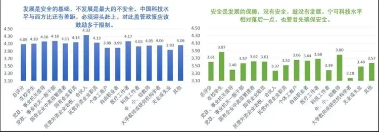 其二,无业或失业群体则相对保守。在问题一中,他们的得分最低,仅为 3.93,这显示出他们对发展的认可度较低。然而,这并非意味着他们认为中国落后,相反,他们大多认为中国已经遥遥领先于西方,因此将安全视为首要任务。由此可见,社会底层群体往往更倾向于认可 “遥遥领先” 的逻辑。从数量上看,中国的研发人员在 2022 年约为 635 万(科技部数据),而无业或失业群体的具体数量虽官方未公布,但考虑到有 6 亿人月收入在 1000 元以下,其规模不容小觑。这两个群体所形成的声量比差十分显着。