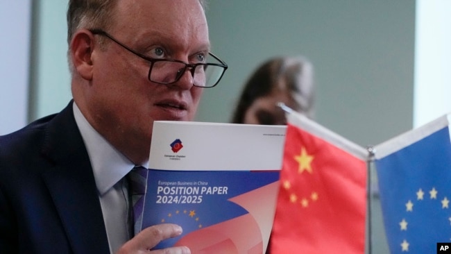 中国欧盟商会会长彦辞(Jens Eskelund)在北京举行的记者会上手拿一本年度欧洲企业在中国立场的报告书。(2024年9月11日)