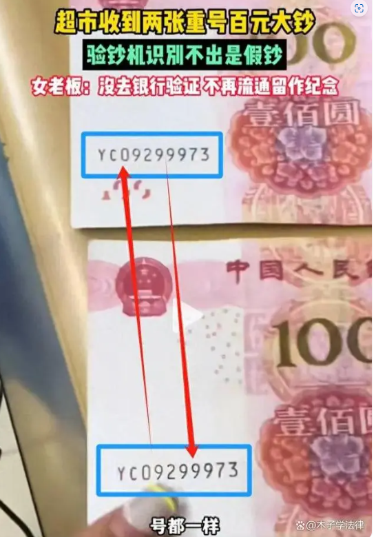 該女性老板在視頻中表示:“這兩張壹定是假幣,哪有兩張同號的,頭壹次遇到這樣的情況。我就留著作紀念吧。”