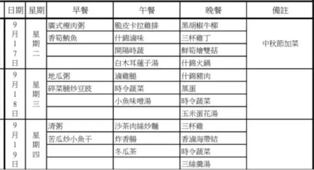 根據台北看守所公開的9月份菜單,今天的特別菜色標示為“中秋節加菜”。早餐方面,提供廣式瘦肉粥搭配香筍鮪魚;午餐則有脆皮卡拉雞排、什錦鹵味、開陽時蔬和白木耳蓮子湯。晚餐菜色更為豐富,包含黑胡椒牛柳、叁杯雞丁、鮮筍燴雙菇以及什錦火鍋。