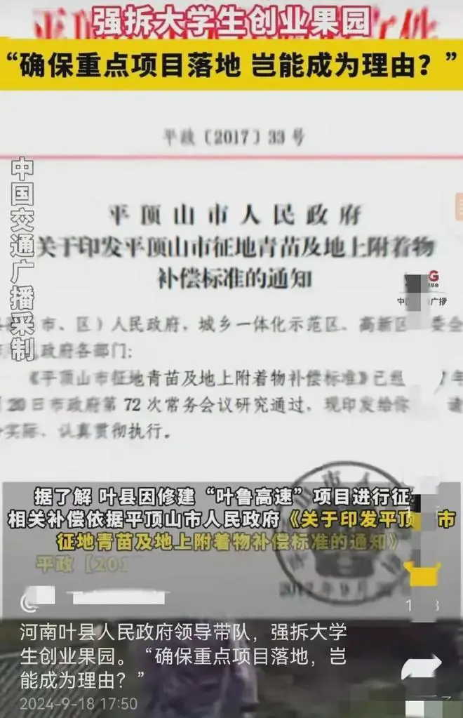 据了解,叶县一位返乡大学生苦心经营了十年的梨园,却因修路项目面临强拆,双方在赔偿问题上产生了严重分歧。
