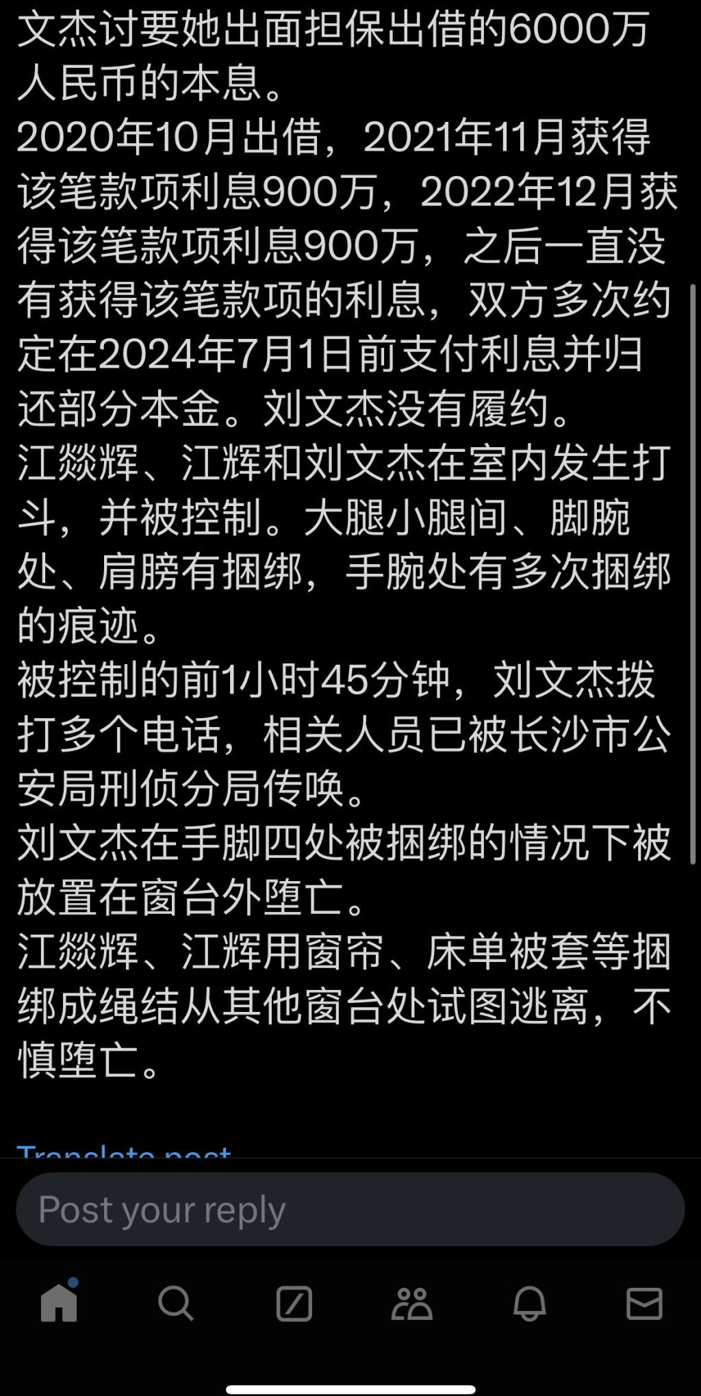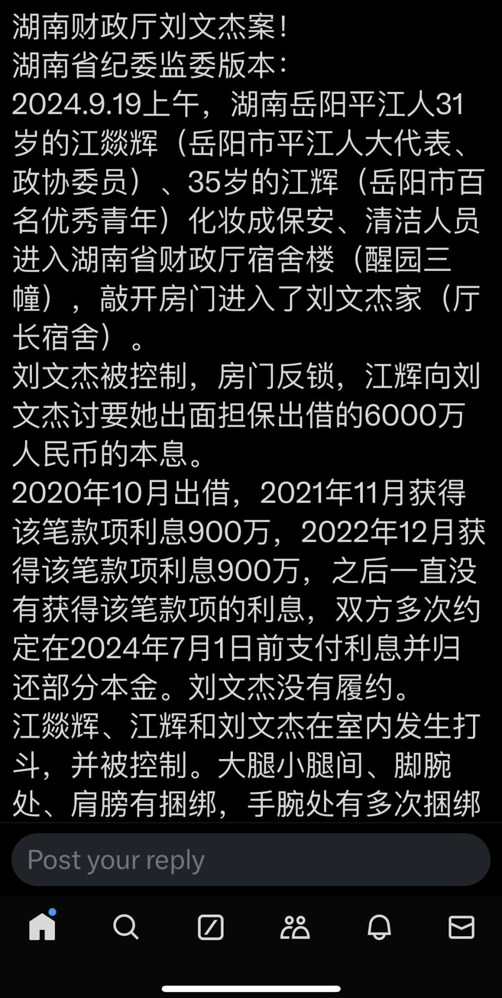 湖南财政厅长刘文杰被人绑架并从楼上扔下致死案。相关传言。/2 pic.twitter.com/j6glCc3yxv— 小径残雪 (@xiaojingcanxue) September 19, 2024