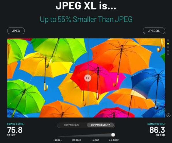 JPEG XL 網站指出,JPEG XL 文件比標准 JPEG 文件小多達 55%,且圖像質量幾乎無損。除了技術優勢外,文件體積減小還能減少對環境的影響。