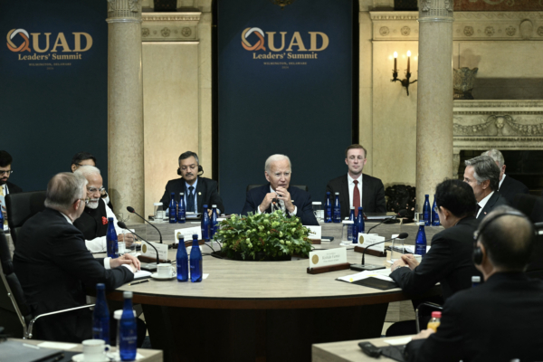 2024年9月21日,美國總統拜登(中)與澳洲總理阿爾巴內斯、印度總理莫迪和日本首相岸田文雄在特拉華州威爾明頓阿奇米爾學院舉行肆方峰會。(Brendan Smialowski/AFP)