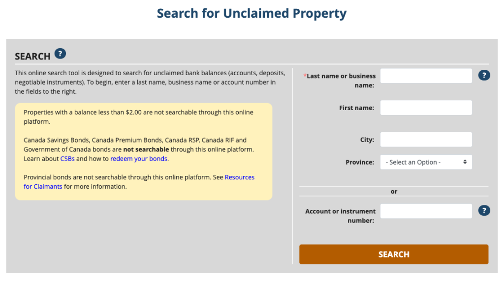 無人認領財產辦公室(UPO)是壹個幫助加拿大人獲取加拿大央行所持資產的機構。 這些資產包括無人認領的銀行余額、加拿大儲蓄債券以及退休儲蓄計劃 (RSP) 和退休收入基金 (RIF) 的金額。