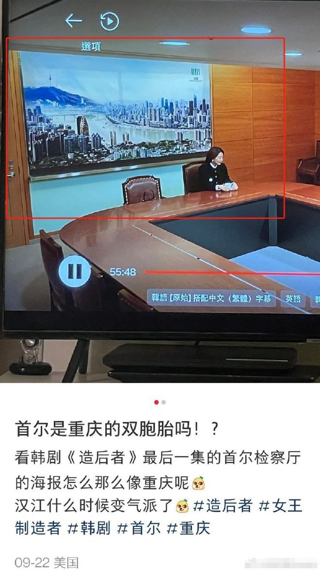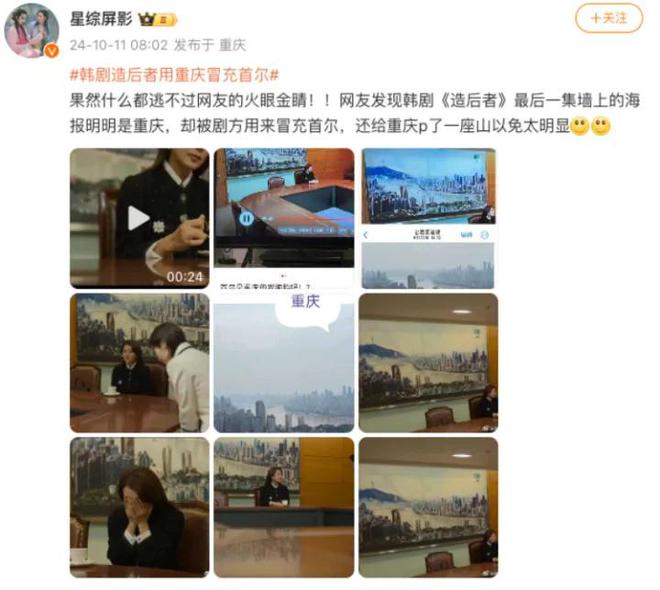 今天,有网友爆料韩剧《造后者》最后一集墙上,一张宣传海报的实际取景地是中国的重庆,而剧组却将其当作首尔展示,并且还在图片中加上了一座山,试图掩盖这一点。这件事在网上引发热议。