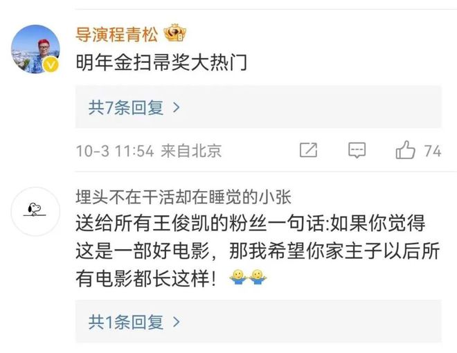 程青松導演在社交媒體上評論這部電影,“明年金掃帚獎大熱門”。