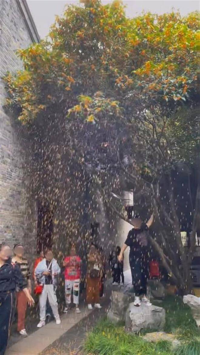 中国大妈为了拍照,在江苏扬州「何园」大力摇桂花树,制造浪漫的「桂花雨」,园区内珍稀金桂秒秃一片。网友拍下影片PO网,网友纷纷抨击大妈的自私行为。