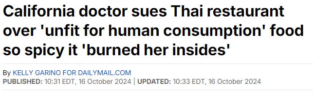 據Dailymail網站10月16日報道 加州壹名醫生因食用壹道她認為“對人類不安全”的菜肴後,起訴了壹家泰國餐館,稱自己因此遭受了化學灼傷。