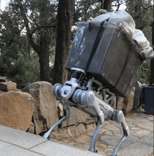 該機器狗是中國知名類人型機器人企業之壹的宇樹科技於2023年11月發布的“Unitree B2工業肆足機器人”。最大荷載120公斤,可以在45度以上的斜面上下自如,所以可以穿梭於山峰各處清運垃圾。
