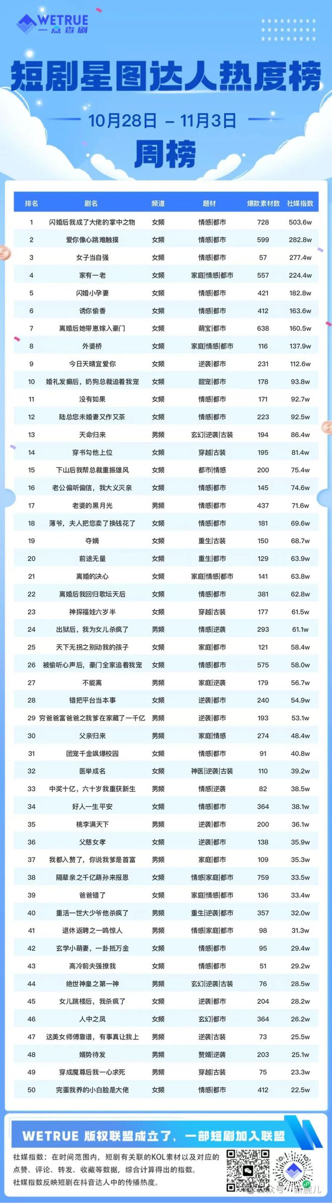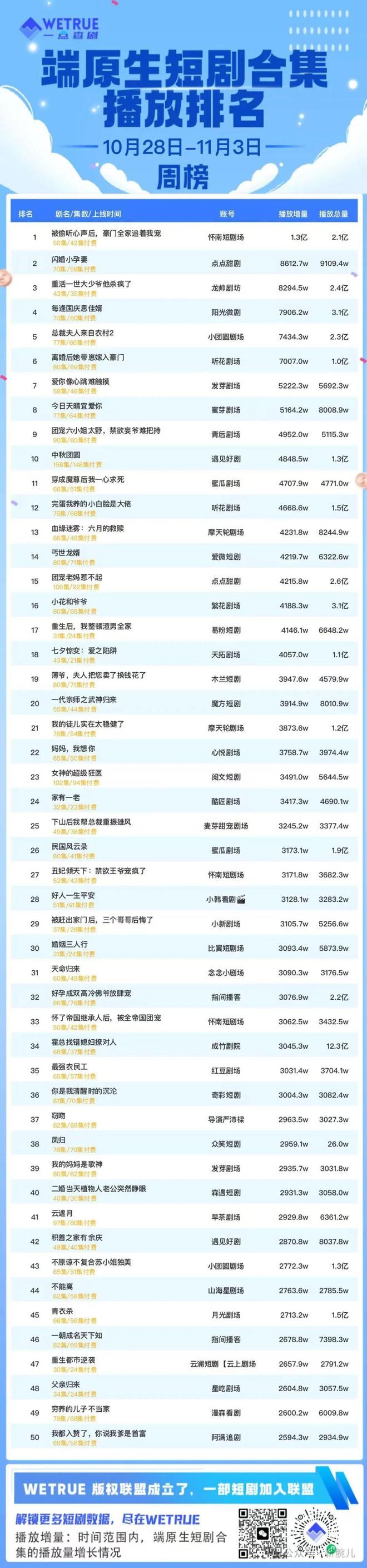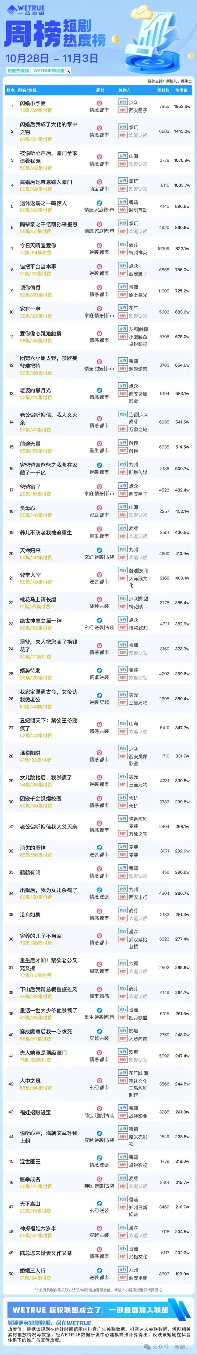11月4日,新腕儿、鞭牛士联合WETRUE一点查剧共同推出11月第1周短剧热度周榜、短剧星图达人热度榜和端原生短剧榜。