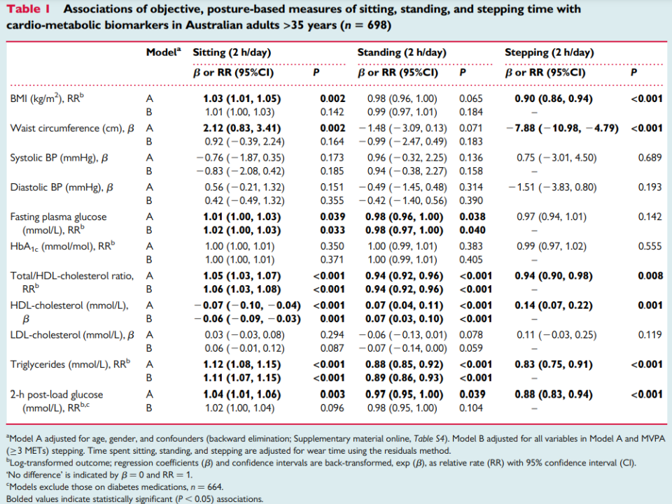 相對於久坐,站著和溜達的好處數據可見。(Healy G N,et al.2015)