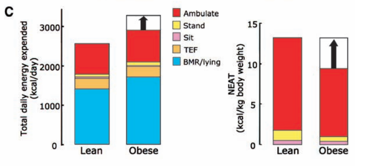 瘦人和胖人比較不同運動習慣能力消耗情況(JA Levine et al,2005)注:TEF:食物熱效應;NEAT:非運動活動熱生成;BMR:基礎代謝率