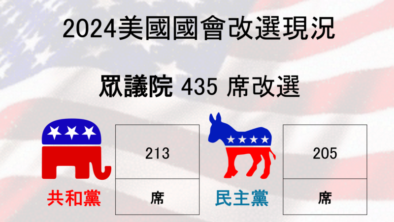 路透社報導指出,11月5日的國會選舉結果仍在計票中,根據艾迪生媒體研究機構(Edison Research)的數據,共和黨在眾議院435個席次中已贏得213席,只需再贏得5席便可掌控眾院。而民主黨目前則取得205席,包括亞利桑那州的史丹頓(Greg Stanton)等多位已確定當選的議員。民主黨要取得多數,需在剩餘的17席中再贏得13席。