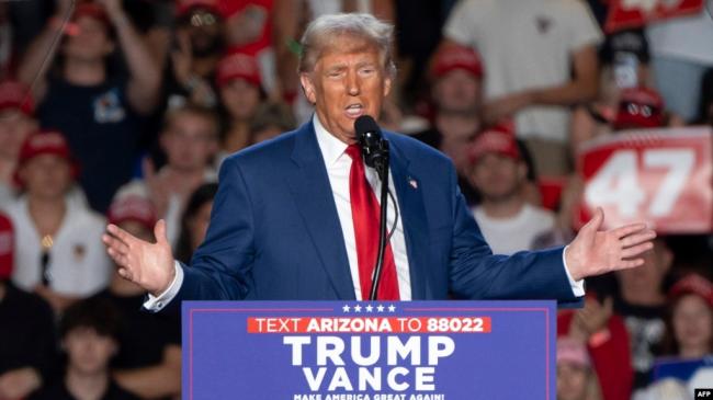 2024年10月24日美國前總統、共和黨總統候選人唐納德·川普在亞利桑那州舉行的競選集會上發表講話。