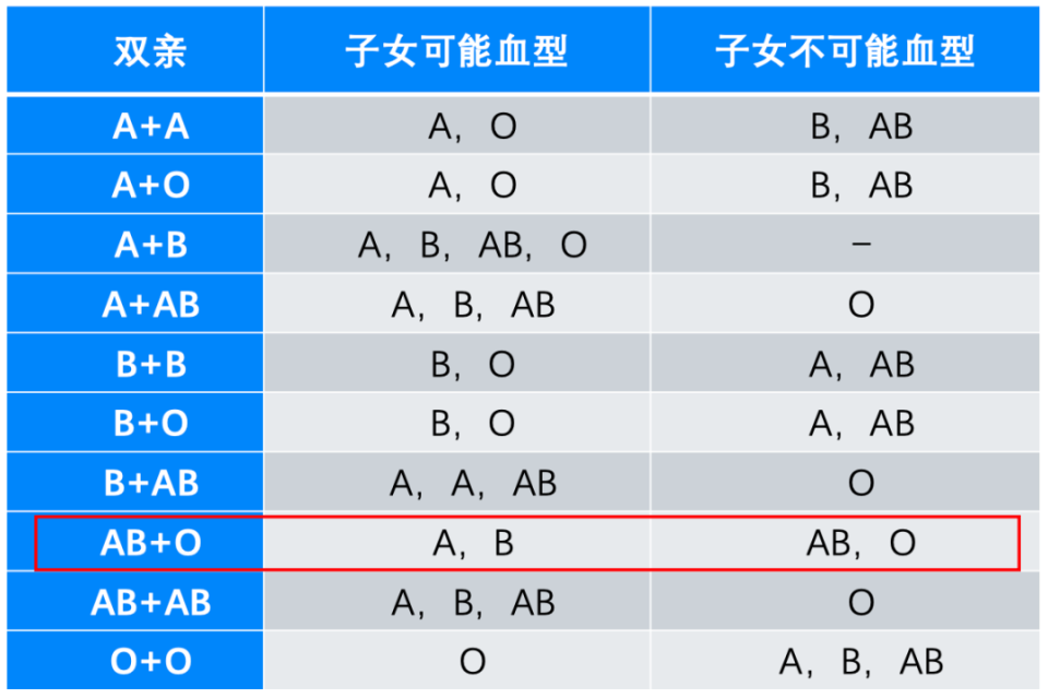 父母子女血型遺傳對照表
