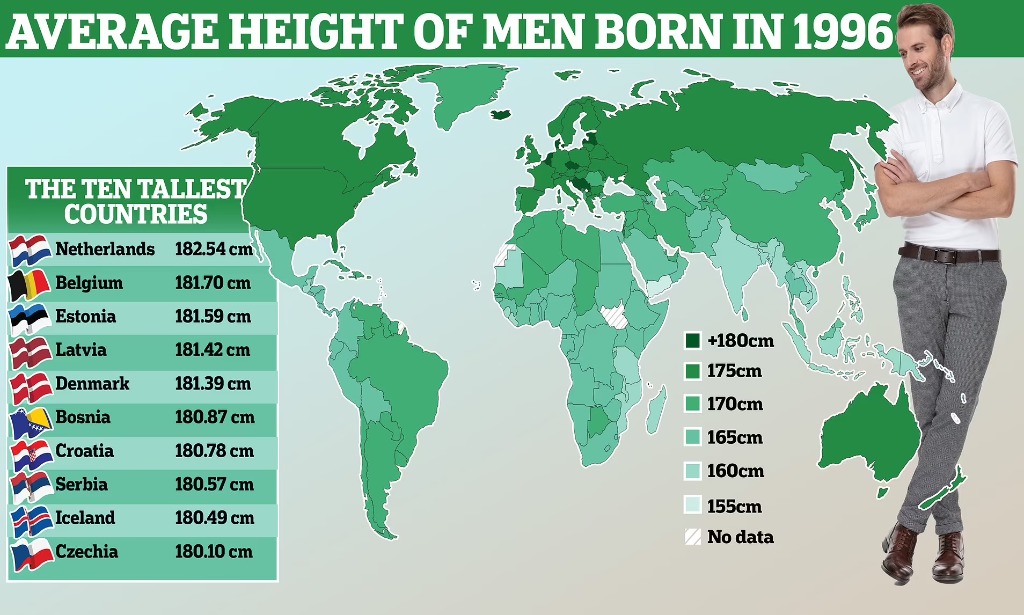 继荷兰之后,比利时(181.70厘米)、爱沙尼亚(181.59厘米)、拉脱维亚(181.42厘米)和丹麦(181.39厘米)跻身男性最高身高前五名的国家。