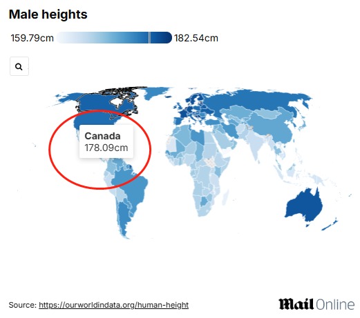 加拿大男性身高平均为 178.09 厘米, 中国男性的平均身高为 171.83 厘米。