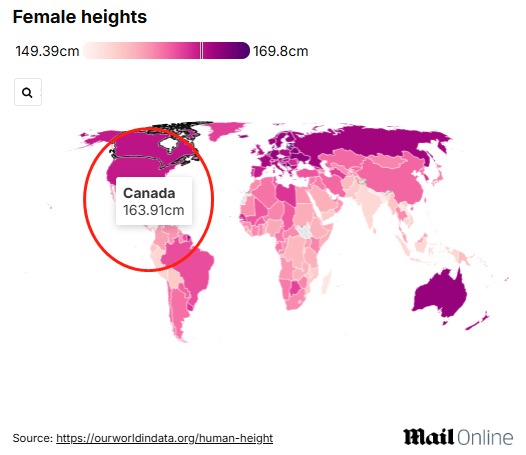 加拿大女性身高平均为 163.91 厘米, 中国女性的平均身高为 159.71 厘米。