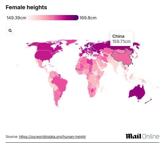 对于女性来说,拉脱维亚(169.80厘米)、荷兰(168.72厘米)、爱沙尼亚(168.67厘米)、捷克(168.46厘米)和塞尔维亚(167.69厘米)都进入了全球女子最高的前五名。