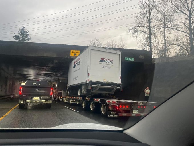 (X)壹個名為"Metro Vancouver Overpass Impact Counter'賬號在社交平台上表示,16個小時前,大溫發生壹輛超高車撞上立交橋的最新事件。