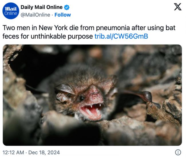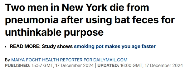 据dailymail报道 纽约州北部的两名男子因吸食受到蝙蝠粪便中真菌污染的大麻而死于肺炎,这两起死亡发生在Rochester,且两名男子之间没有关联。