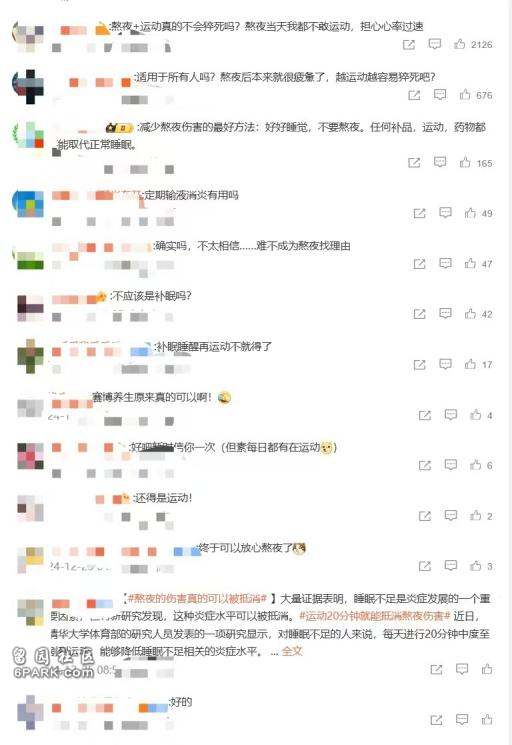 還有壹些網友表示,大家解讀這壹研究結論存在偏差,“都是啥理解能力?不是熬夜運動,熬夜完有時間當然首選補覺,說的是不困的時候去運動,抵消熬夜對身體的潛在危害。”