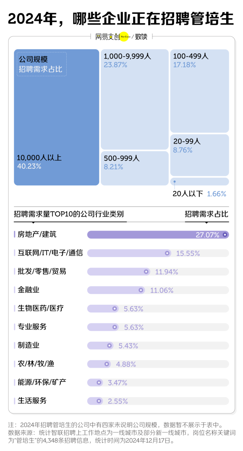 从行业类型上看,虽然地产管培生被调侃为“时代的眼泪”,但在招聘需求里仍然占据大头,互联网、零售与金融行业的招聘需求占比也均超过 10%。