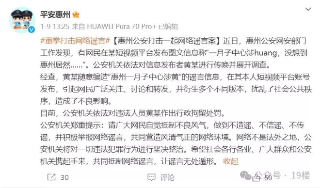 近日,惠州公安工作时发现,有网民在网上发布图文称“一月子中心涉huang,没想到惠州居然……”公安机关依法对信息发布者黄某进行传唤并展开调查。