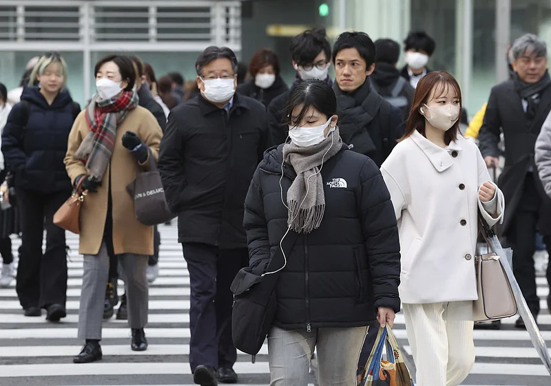 △1月9日,日本流感患者激增,民眾戴口罩出行。