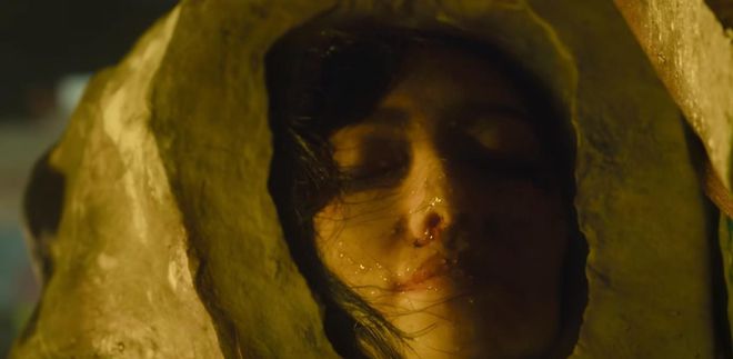 打開之後發現開頭及暴擊,玉石市場,眾人圍觀之下,碩大的賭石中少女頭顱顯現。