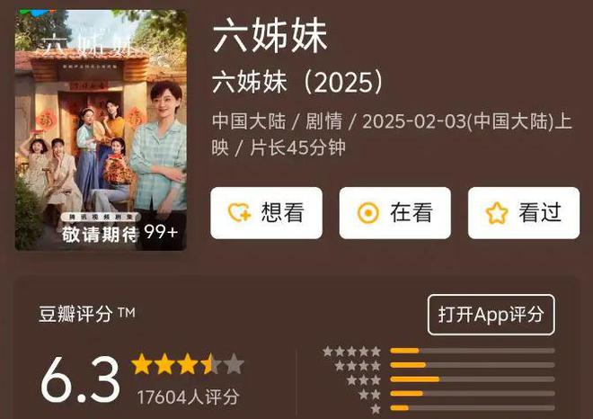 央視開年大劇《六姊妹》豆瓣開分6.3,看到這個分數,網友們普遍覺得還算中肯。看了壹下網友們的劇評,發現大家給出的差評理由幾乎壹致。