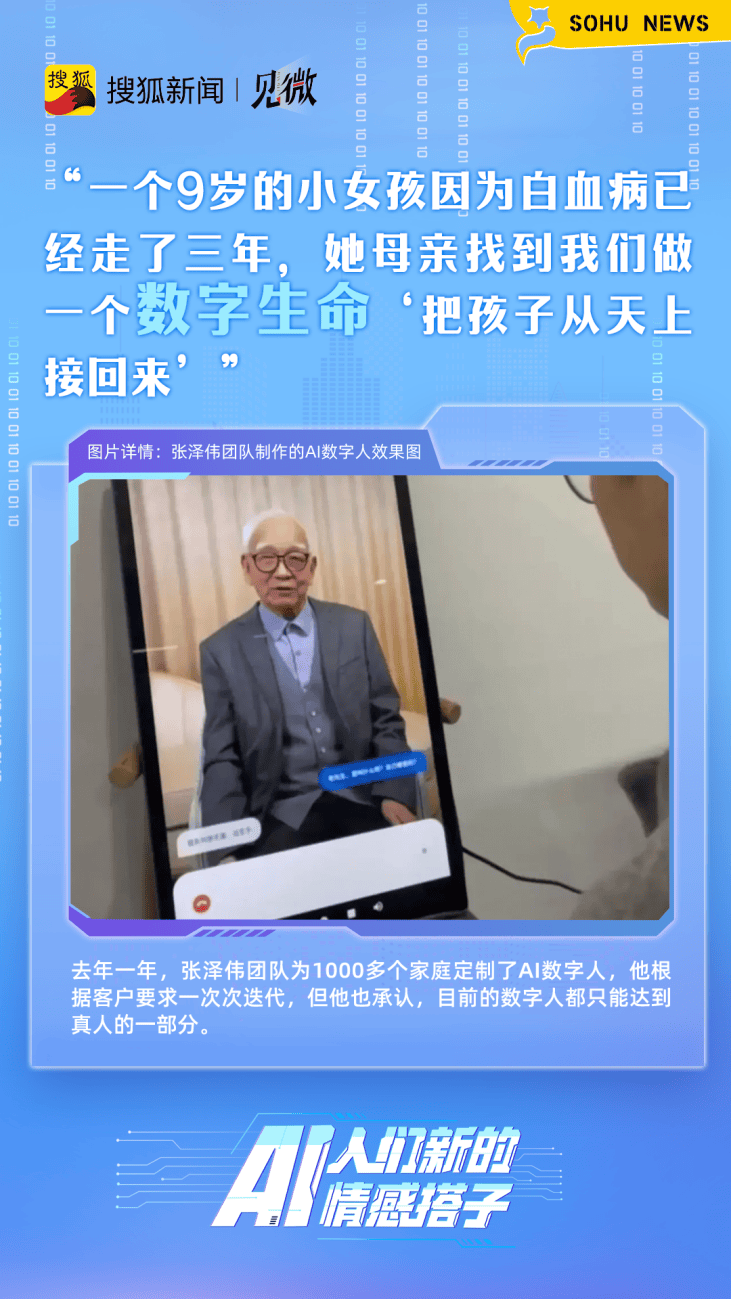 后来,张泽伟遇到的需求越来越多,也越来越具体,AI换脸对话无法满足这么多的需求,张泽伟就开发出了能自己说话的AI数字人,再后来,可以互动的数字生命诞生,接到了大量的订单。其中有一个9岁的小女孩因为白血病已经去世三年了,她母亲找张泽伟做一个数字生命,对她来说是这是 “把孩子从天上接回来”。- 新闻来源于其它媒体,内容不代表本站立场!