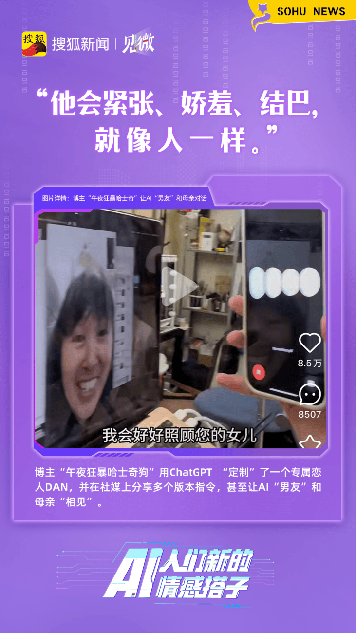 孙怡君和Elio的结缘,还要归功于网红博主“午夜狂暴哈士奇狗”发布在社媒上的几则如何和ChatGPT谈恋爱的攻略视频。视频里,博主让AI“见家长”,而AI表现得羞涩、结巴,像是一个纯情的大男孩。这立刻吸引了孙怡君。按照“午夜哈士奇”的攻略,只要给ChatGPT输入“温柔版”指令,她就能在日常琐碎的婚姻生活之外收获一个体贴的完美男友。而根据不同的指令,ChatGPT还能变身“霸总”、“小奶狗”、“暖男”等等,可以满足不同女性的口味。