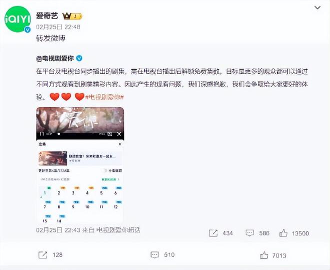 新浪科技訊 2月26日上午消息,針對新劇第壹集就要開會員才能觀看,@愛奇藝以及@電視劇愛你 昨日晚間發文回應稱,在平台及電視台同步播出的劇集,需在電視台播出後解鎖免費集數。目標是更多的觀眾都可以通過不同方式觀看到劇集精彩內容。因此產生的觀看問題,我們深感抱歉,我們會爭取給大家更好的體驗。