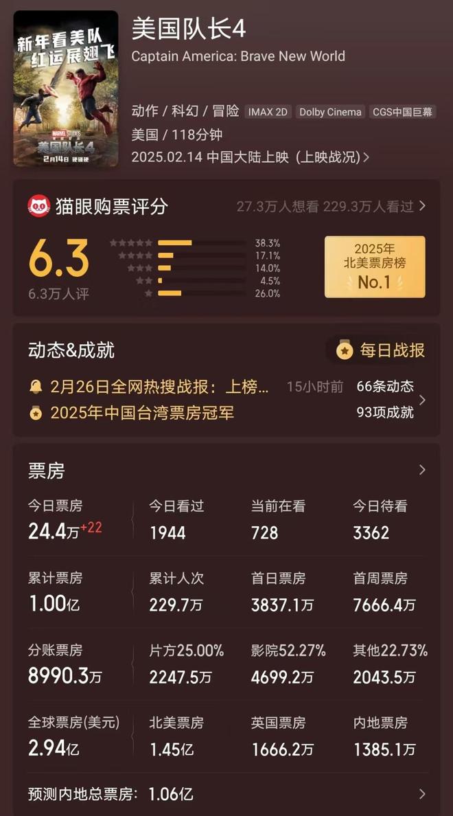 後者在中國市場僅收1.05億人民幣票房,創下漫威電影(除《驚奇隊長2》)在華最差成績。此外,燈塔專業版AI預測該片最終票房約為1.11億元人民幣。