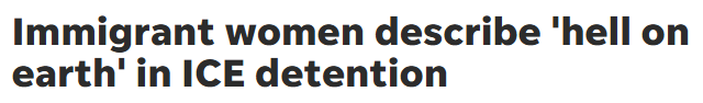 據USA Today 3月23日報道 幾名移民(专题)女子說,她們在美國移民和海關執法局(ICE)的拘留所裡被“像動物壹樣”關押,條件極端惡劣,她們擔心自己的生命安全。