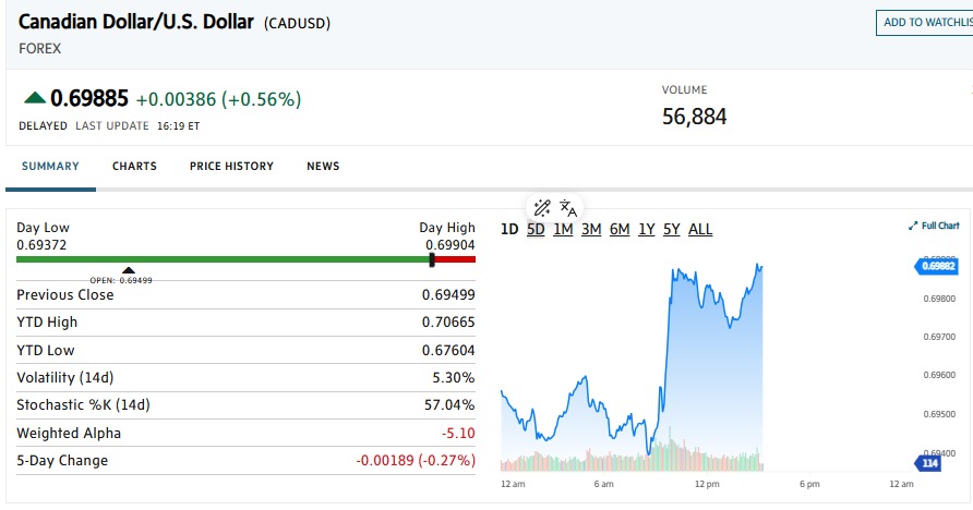 今天 ,加元兌美元匯率上漲0.4%,報1.4325加元,或69.81美分,早些時候曾觸及3月14日以來的最弱盤中水平1.4415加元。