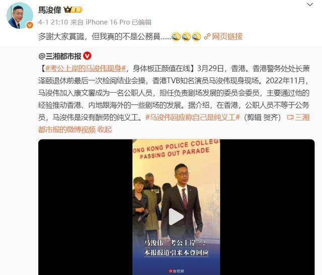 4月1日,馬浚偉發出2年前的采訪報道澄清:“多謝大家賞識,但我真的不是公務員。”
