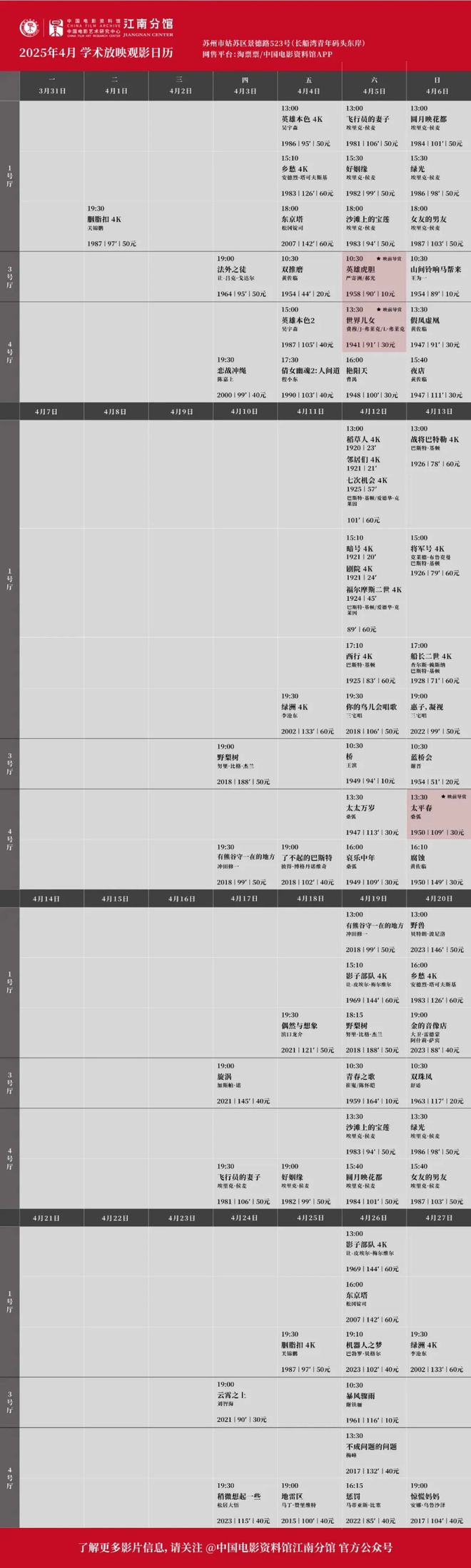 本周末苏州巴斯特·基顿大师专题开启,只有一轮,4月12日还有“月下姑苏”《花样年华》告别场震撼上映,期待光临。五月江南分馆片单已准备就绪,将在4月28日北影节结束次日发布,五一小长假佳片不停歇。所有场次均可在淘票票、中国电影资料馆APP购票,具体排片见末图,祝大家观影愉快。??