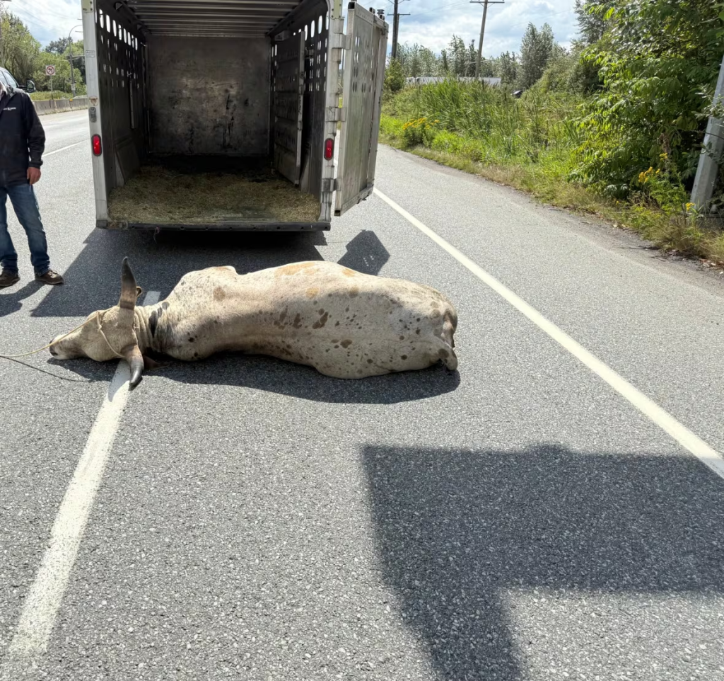 壹頭公牛闖入BC省阿伯茨福德的 11 號高速公路後,當地獸醫不得不為其注射鎮靜劑 (阿伯茨福德警察局)