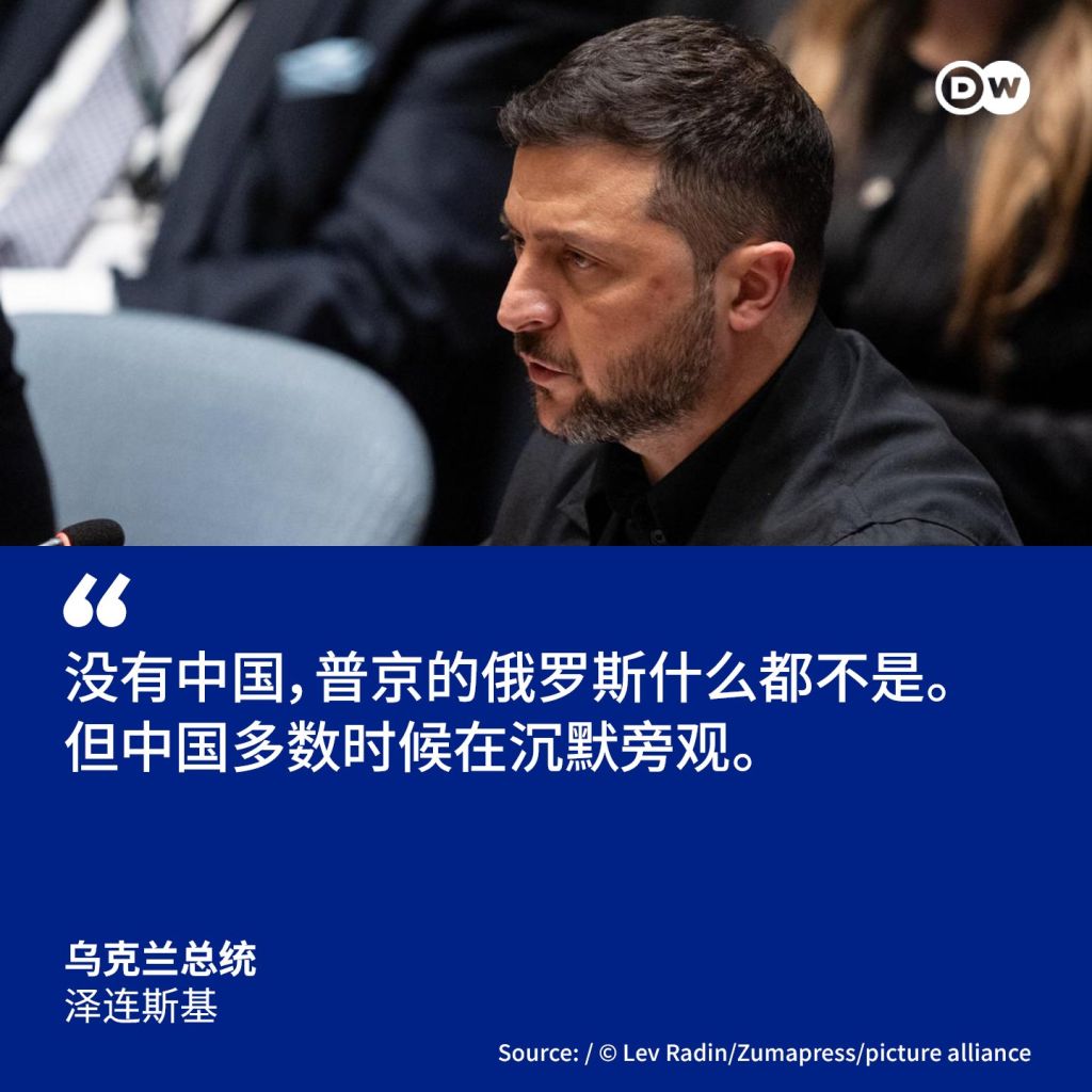 烏克蘭總統澤連斯基周贰在聯合國安理會發言時,再次批評中國在烏克蘭戰爭問題上的不作為,呼吁北京對莫斯科施壓,因為俄羅斯“完全依賴”中國。… pic.twitter.com/Lt42wlMbYn— DW 中文- 德國之聲 (@dw_chinese) September 24, 2025