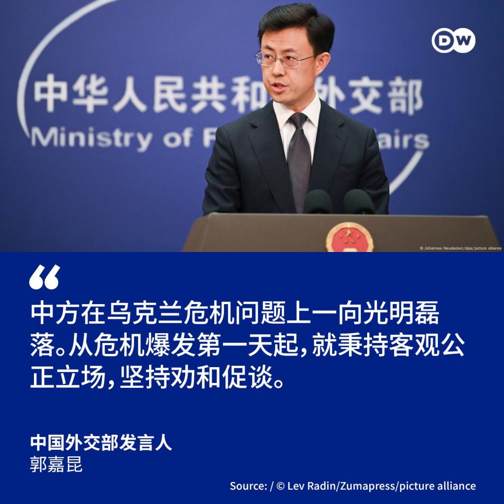在周叁的中國外交部例行記者會上,有記者就澤連斯基前壹天的說法詢問中方有何評論。外交部發言人郭嘉昆回應表示,中方在烏克蘭危機問題上“壹向光明磊落。從危機爆發第壹天起,中方就秉持客觀公正立場,堅持勸和促談,有關各方對此是清楚的。”
