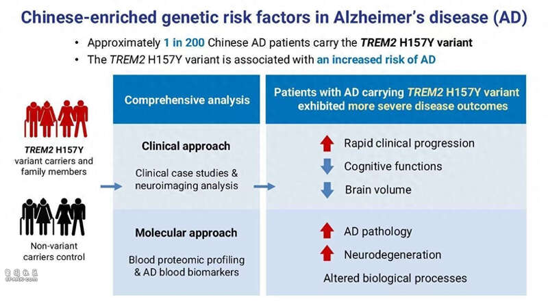 临床个案研究显示,与非携带者相比,同时带有TREM2H157Y遗传变异及APOE-ε4风险因子的患者,在早期阶段临床病情恶化速度更快。认知评估、神经影像学及阿尔茨海默病血液生物标志物分析显示,携带TREM2H157Y遗传变异的阿尔茨海默病患者,其认知功能衰退更显着、神经退行性病变更严重,以及阿尔茨海默病病理更为严重。