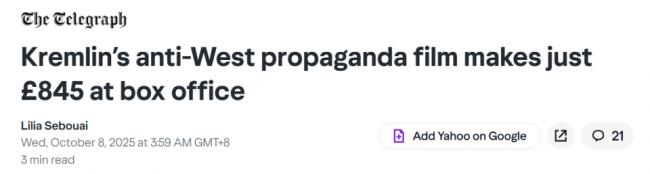 10月8日《每日电讯报》报道称,克里姆林宫砸巨资、动员了俄罗斯全明星阵容的一部批评西方“道德沦丧”的俄语宣传片,仅收到845 英镑票房,三周后就被撤下电影院。成为俄罗斯自苏联解体独立之后,最差的电影票房,没有之一。