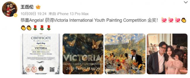 10月9日,李湘和王岳伦分别在平台分享了喜讯,称女儿王诗龄获得维多利亚国际青少年绘画大赛(Victoria International Youth Painting Competition)金奖,并晒出相关证书。